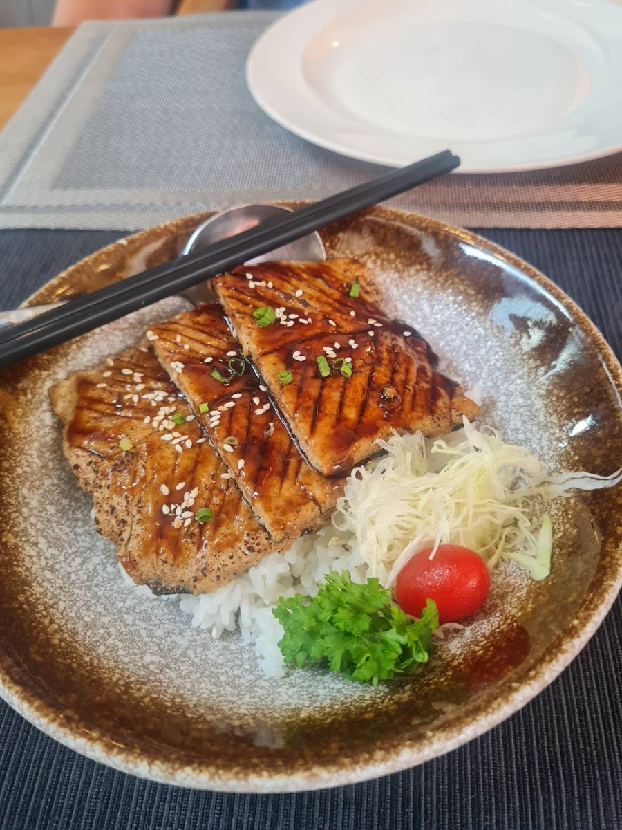 I visited this restaurant for my friend's birthday. I really enjoyed the food at this cosy restaurant. The staff are super friendly and the menu is vast featuring Korean/ Thai/ Chinese food and a good range of desserts aswell. I enjoyed the Chasu Don, the vegan fish and the turnip cake. Right now, the restaurant has Christmas decorations and a beautiful tree. It's also a hotel. I didn't stay here but my friend told me the rooms are a good size and the breakfast is very tasty. Their sister restaurant is Vegan Mahanakhon.
